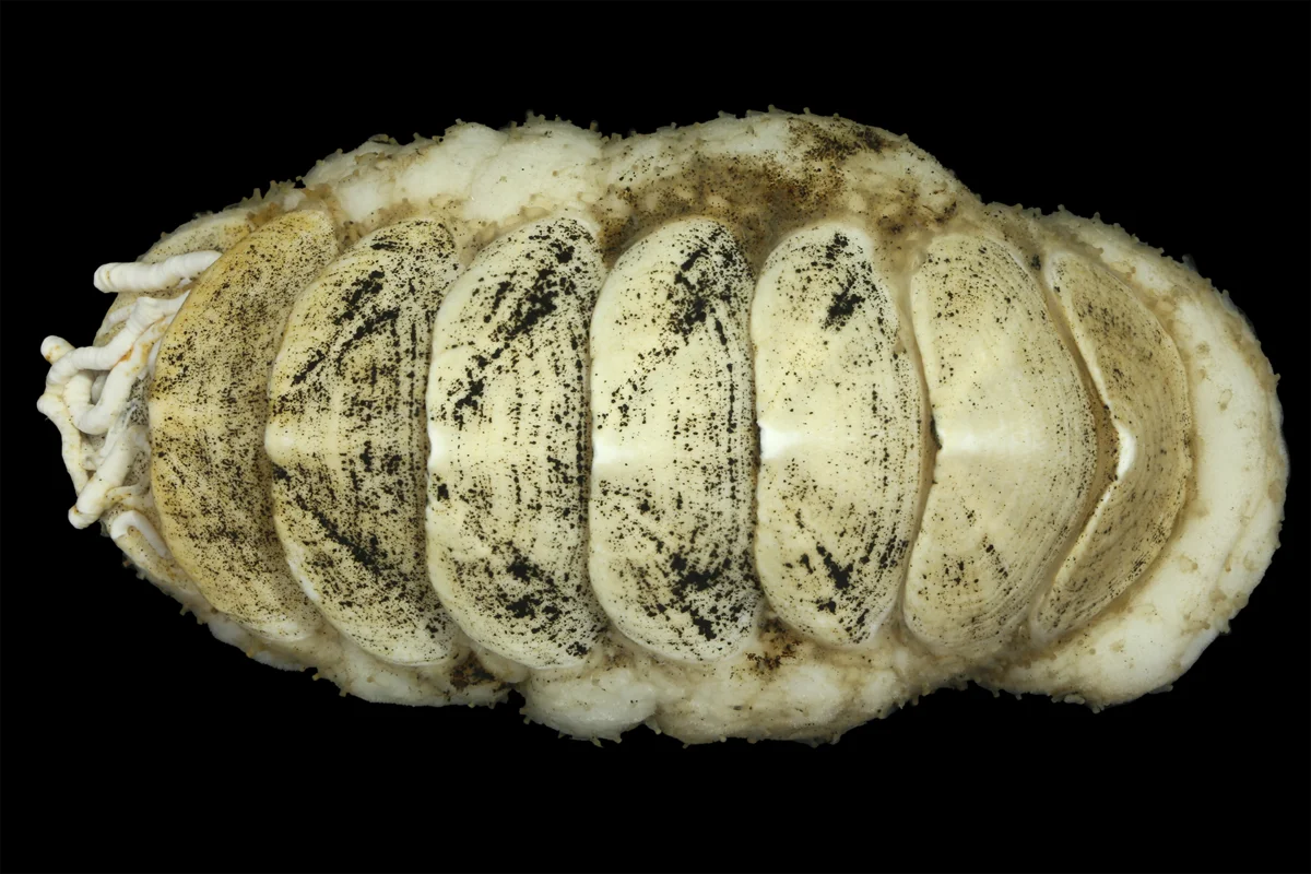 Los quitones suelen describirse como una mezcla entre caracol y escarabajo. En lugar de una sola concha, tienen ocho placas superpuestas que les permiten adaptarse a superficies irregulares o enrollarse para protegerse. En este caso, además, el animal cuenta con una rádula —una especie de lengua áspera— reforzada con hierro, y convive con pequeños gusanos que aprovechan sus restos orgánicos.