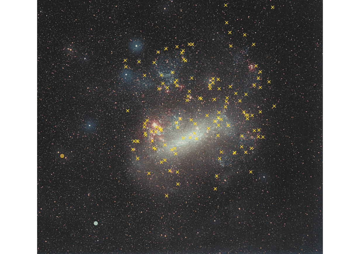 Los restos de supernova J0624-6948 y J0614-7251 aparecen como dos círculos en la parte inferior izquierda de la imagen, uno naranja y otro azul. Las cruces amarillas representan restos de supernova previamente descubiertos. Lo sorprendente de estos dos nuevos hallazgos es su ubicación inusual, lejos de otras explosiones estelares conocidas.